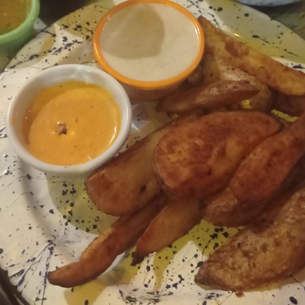Tremendas. No solo la papa que estaba perfecta, crocante y sabrosa sino las dos salsitas que acompañan . No le faltaba sal . Un plato como entrada bastante barato y para compartir.