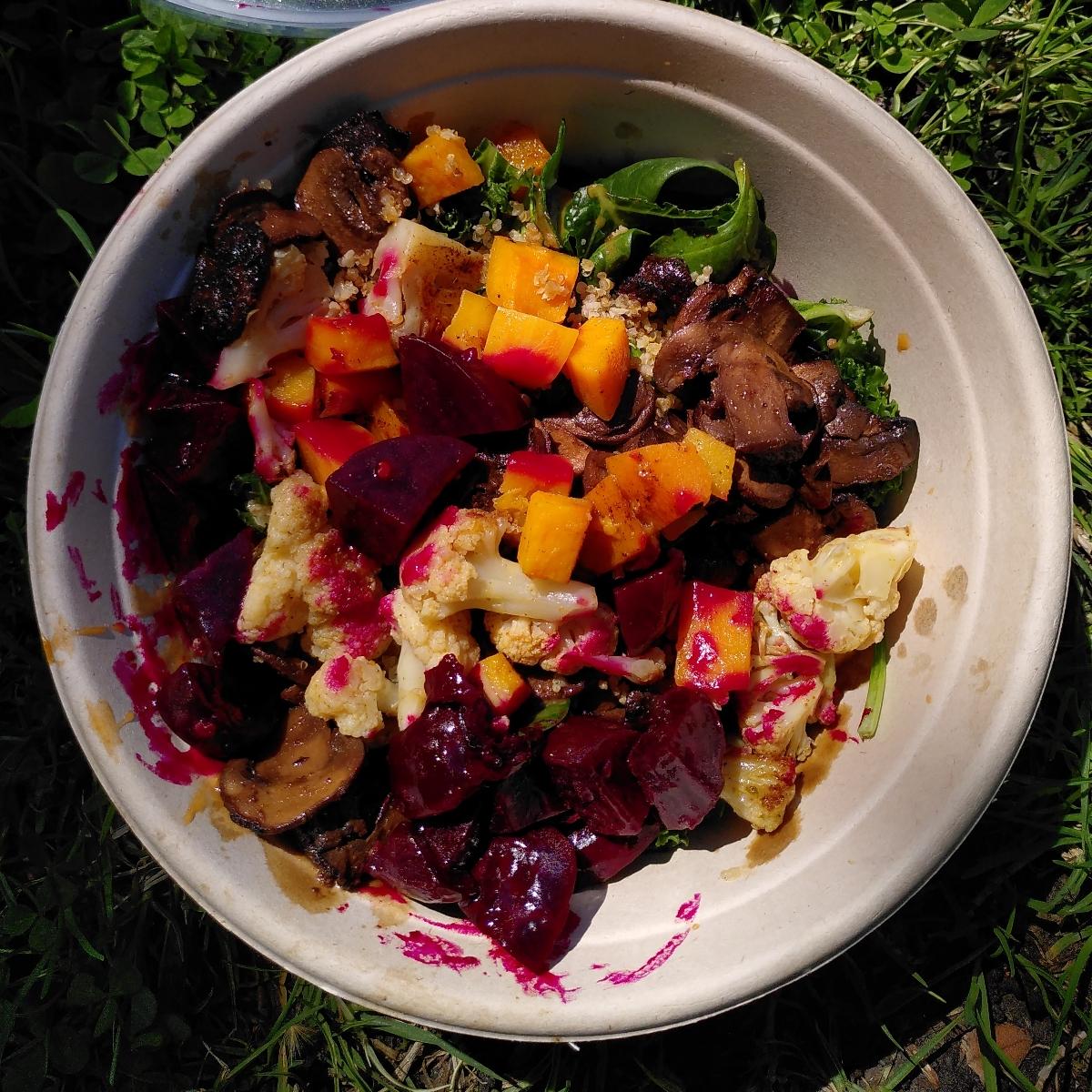 Grilled tamari mushrooms, roasted butternut squash, turmeric cauliflower, red beets. All comes with ancient grains and chipotle marinated power greens. A lovely bowl, the mushrooms in particular are amazing!!