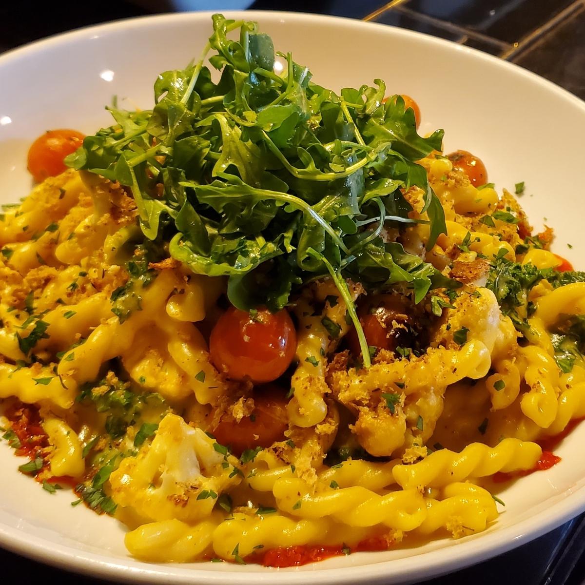 wowwww. they updated the cauli cashew mac to add some spice, and arugula and sweet juicy lil tomatoes that just perfectly complement the flavor profile. it's filling, delicious, and well plated. one of my favorite vegan pasta dishes I've ever had!!!