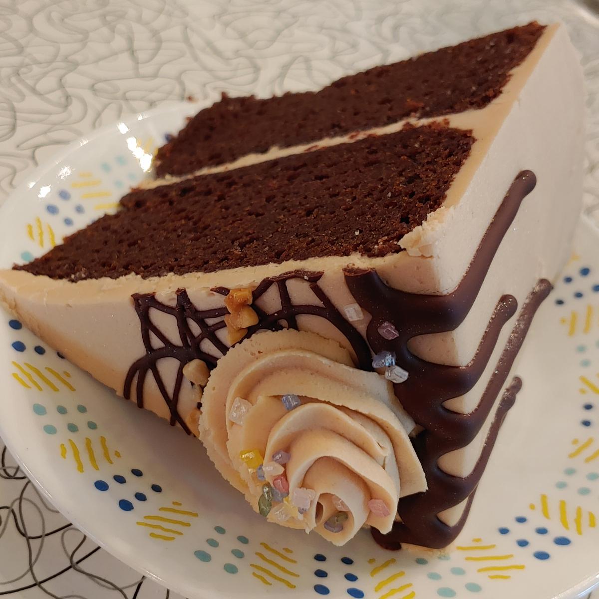 I am not a chocolate cake fan, but I love peanut butter, so I thought I'd give it a try. As with the other cakes I've had at Spiral Diner, this cake felt denser and heavier...more filling. It's not a bad thing -- just an observation. The chocolate was not as sweet as a traditional sheet cake. The frosting was glorious! Thick creamy peanut buttery and sweet! The was a decent-sized piece of cake. Due to the size and richness, I could only eat about half. I happily ate the rest later. .The ratio of frosting to cake was almost perfect; It was 40% frosting: 60% cake. I tend to like more frosting than the average person. I would have preferred 60% frosting: 40%. Fortunately I had a friend who was more than happy to help me even out the percentage with a few bites of cake. I can't give it five stars for nutrition -- it's cake, after all.