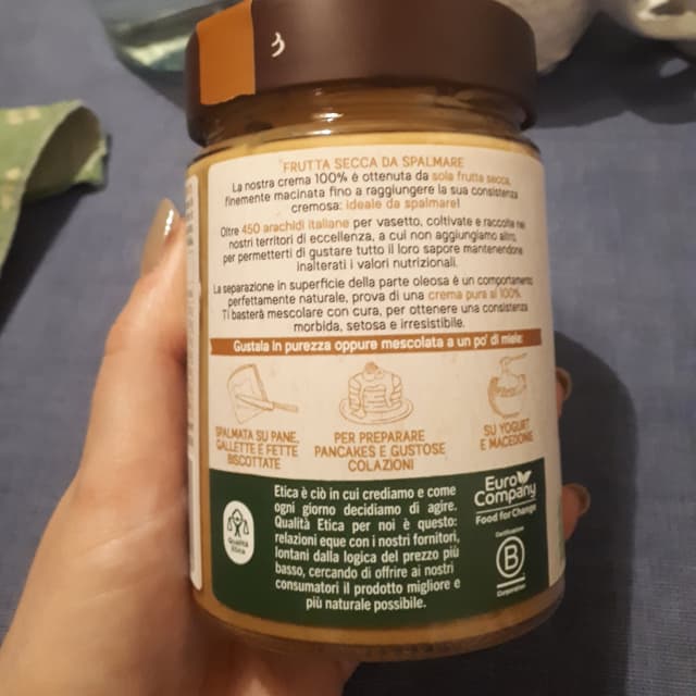 Ottimo burro di arachidi, senza olio di girasole. Non é crunchy, ma liscio. Non avendo sale aggiunto non risulta il retrogusto salato, ma si sente la tostatura delle arachidi.