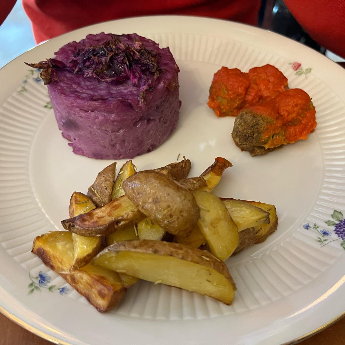 Risotto al cavolo viola, patate al forno e falafel con sugo di pomodoro.Tutto molto buono, specialmente il risotto.Posti davvero bello, consiglio vivamente