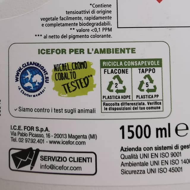 Mi sembra davvero un buon prodotto. Io non colgo sempre la differenza tra un detersivo e l'altro ma questo mi sembra che funzioni, pulisce bene anche a basse temperature. Ha poi dei plus non trascurabili: confezione di plastica riciclata 100%, completamente biodegradabile senza fosfati, edta e coloranti, consigliato da Legambiente. Mi lascia un po' perplessa la dicitura "siamo contro i test sugli animali" senza nessuna certificazione a riguardo. Meglio comunque di altri prodotti, penso che lo ricompreró ammesso che mi ricordi dove l'ho comprato... 🤔