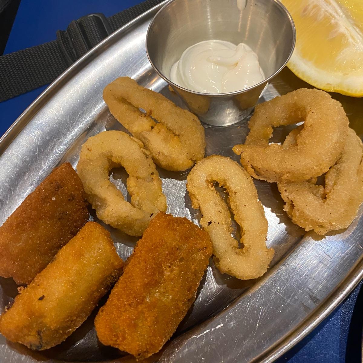 Lo que se ve en la foto es media ración de calamares y media de croquetas de setas al ajillo, riquísimo!