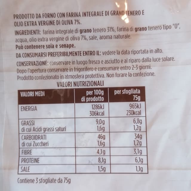 Sfoglia con farina integrale ideale per piadine, tortillas, wrap. Io adoro farcirla con lenticchie, carote e cipollotto saltati in salsa di soya, rucola e olive taggiasche.