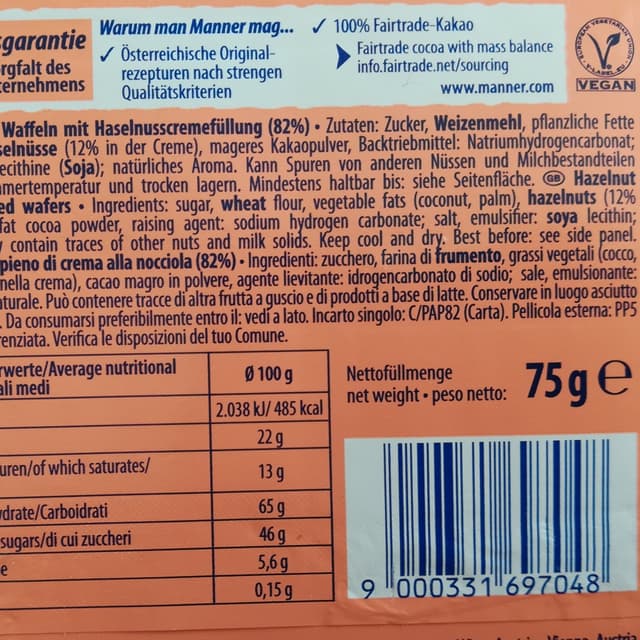 Wafer vegan, gusto nocciola. Fragranti, molto buoni, forse un po' troppo dolci ma comunque buoni. Piuttosto peccato per gli olii di palma e cocco. In Italia si trovano saltuariamente da Lidl, se no mercato tedesco.