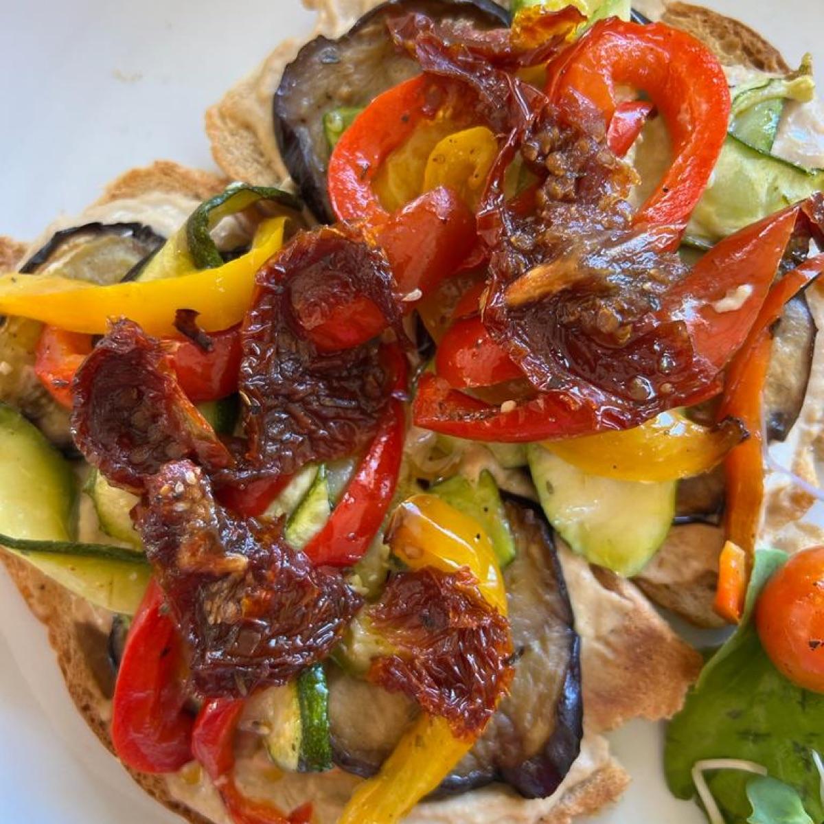 YumSourdough toast, hummus generously spread and topped with roast veg and sun dried tomatoes. Lovely balanced and tasty.