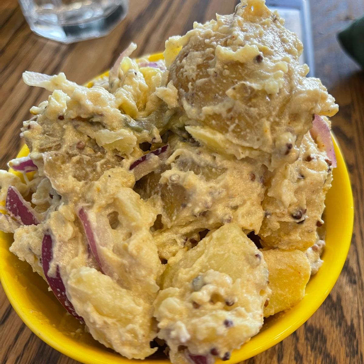 I’ve never seen potato salad made with cashew cream so I had to order it. This was delicious!! It was creamy and had pickle slices in it. #veganisnotscary