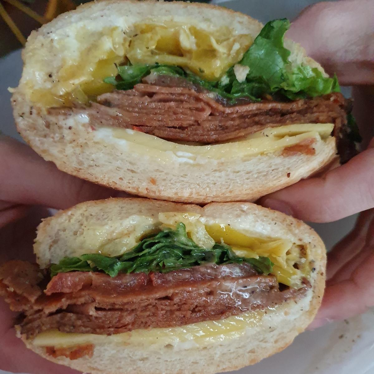Such a yummy Italian Sub with all the classic toppings. It has deli meat, cheese, lettuce, tomato, onion, deli mustard, banana peppers and vegenaise with a touch of oil and vinegar on a white sub roll