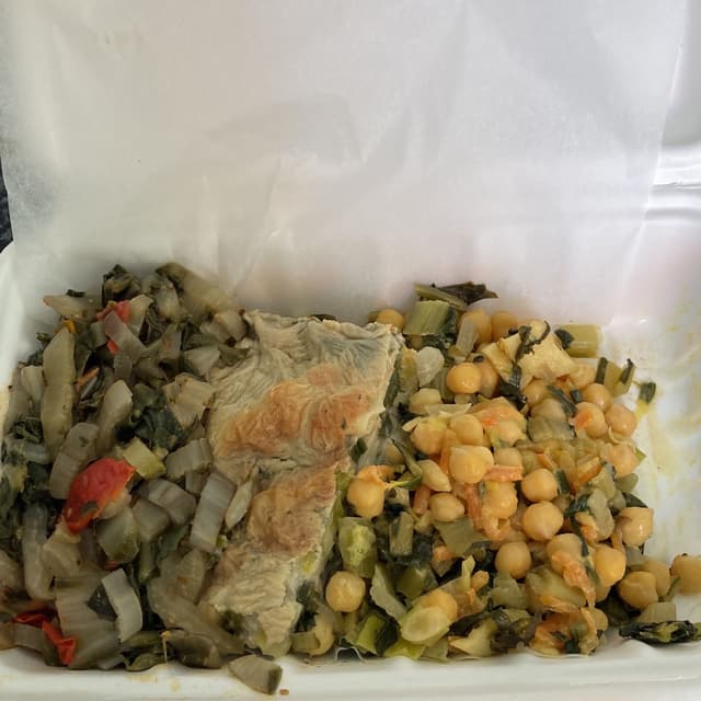 Catalogna con pomodorini, lasagne alla boscaiola e ceci alla senape con verdure. Tutto biologico