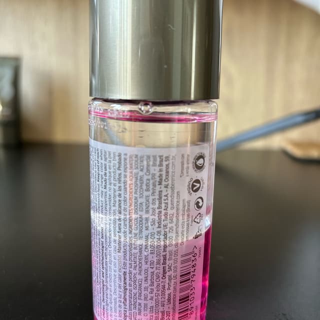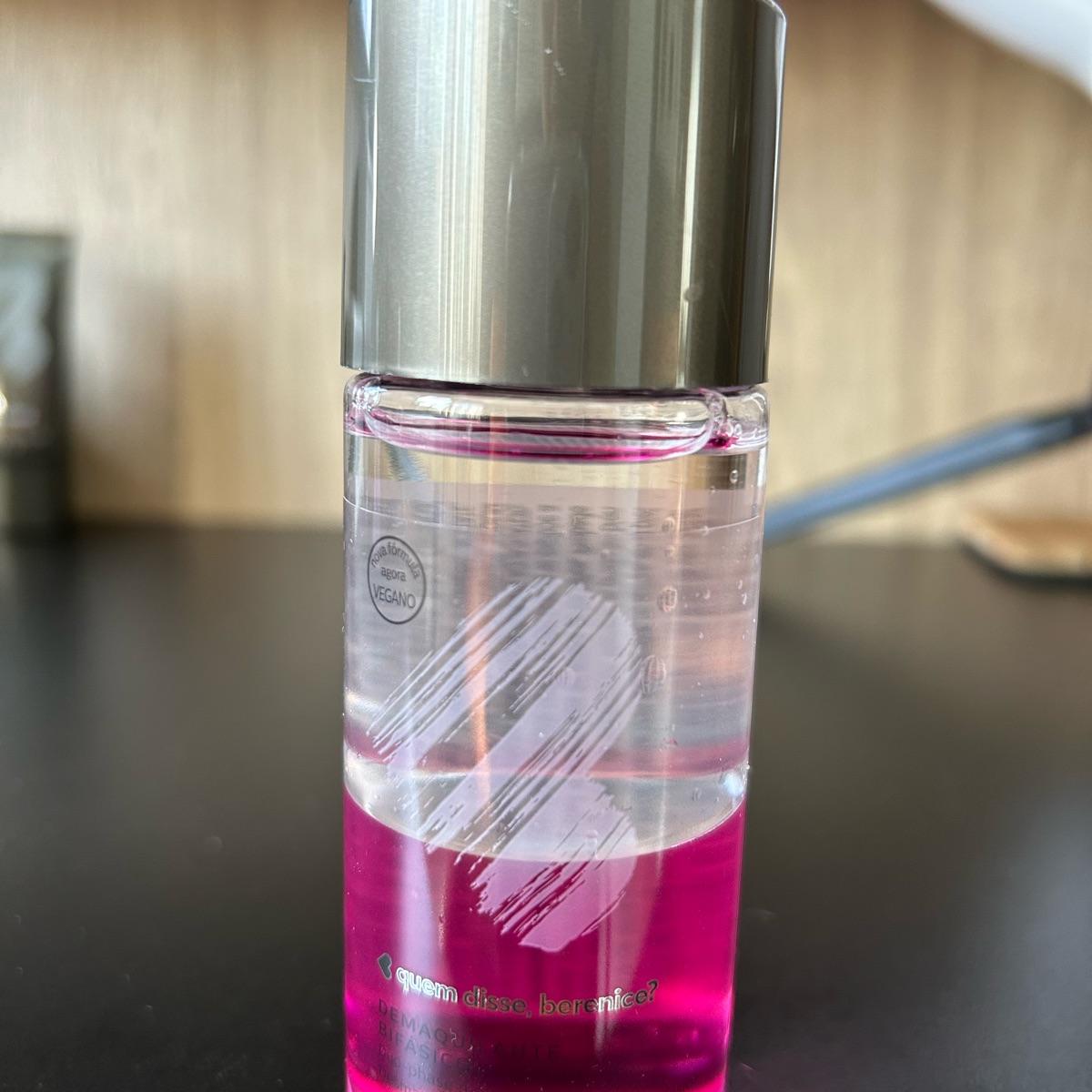 Demaquilante bifásico. Basta umedecer bem o algodão e passar no rosto; retira bem a make