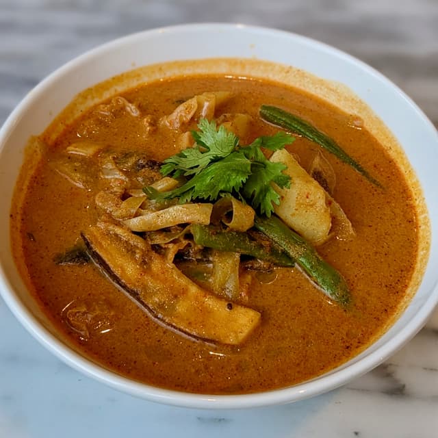 Large bowl of housemade curry soup made with organic soy milk and extra virgin coconut oil. Definitely tasted lighter and cleaner than the usual coconut milk curry, but still nicely spiced! Served with organic sun-dried noodles, taupok fried tofu puffs, long beans, cabbage, eggplant, and potatoes (which seemed extra tasty, perhaps the potatoes were pre-fried/roasted?) (Allium-free, $15.80) #sgvegan #wholefoodplantbased #wfpb #organic
