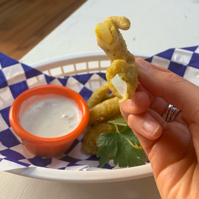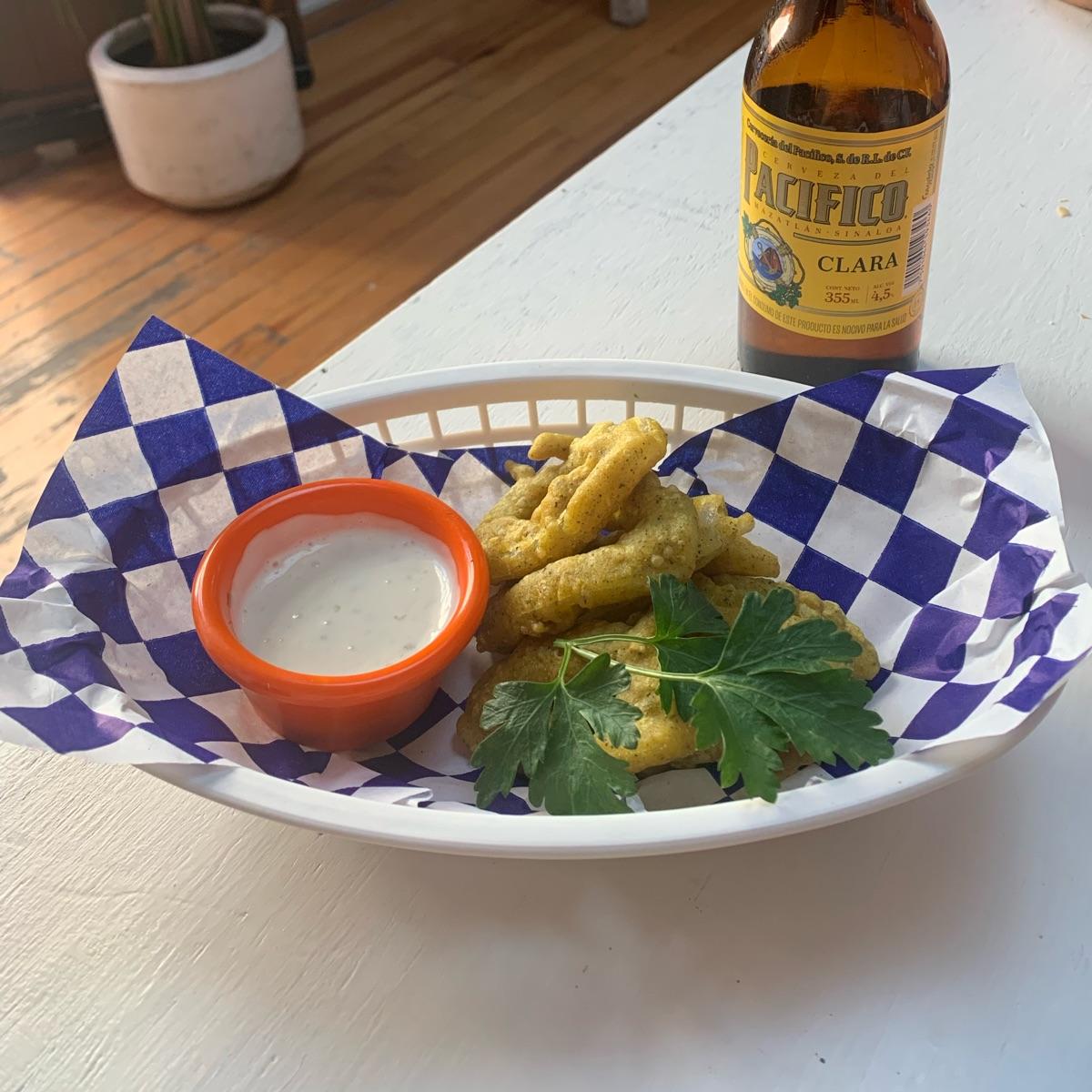 Esto que vemos es una entrada deliciosa, se trata de un arito de tubérculo capeado, el tubérculo tiene una textura gelatinosa pero en sí el sabor está en lo capeado y sabe delicioso, además los acompañan con una salsa tártara que está riquísima. A mí me gusta ponerle unas gotitas de limón 🍋 y un poquito de salsa para extra sabor. Se los recomiendo mucho 😉 #vegan #leavethefishinthesea #veganfish #veganinmexico