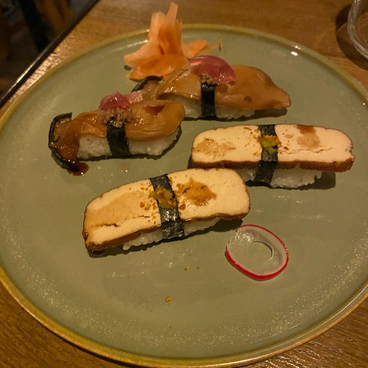 Nigiri al tofu affumicato (quello più chiaro in primo piano) molto equilibrato. Tofu di alta qualità. Consigliatissimo