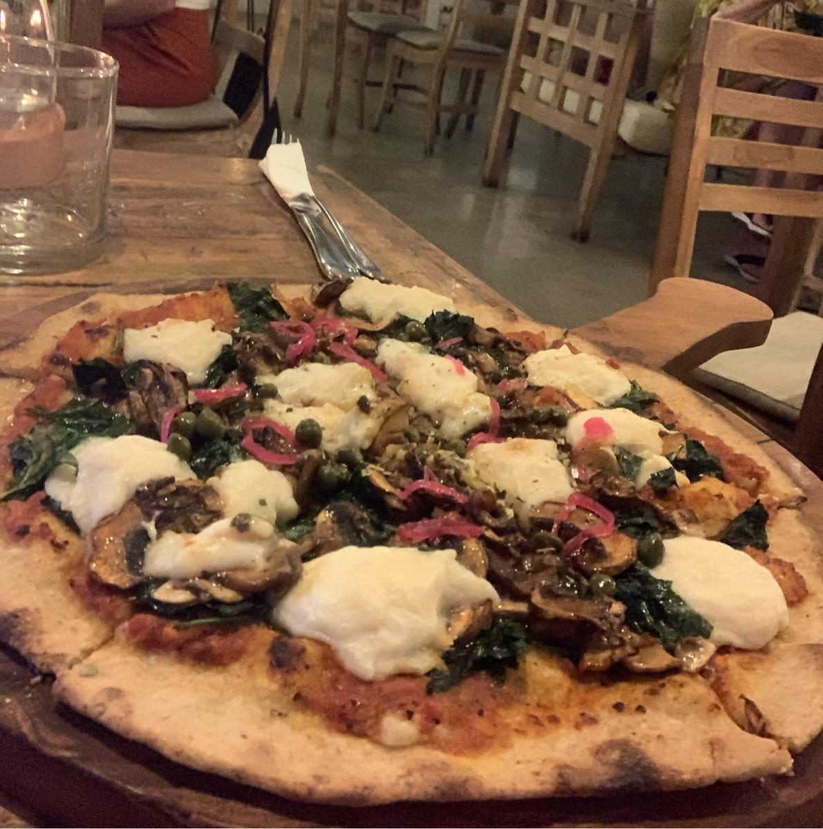 This is the menu description: “Thin spinach crust topped with mushrooms, spinach, pickled shallots, capers, and pili nut cheese.”