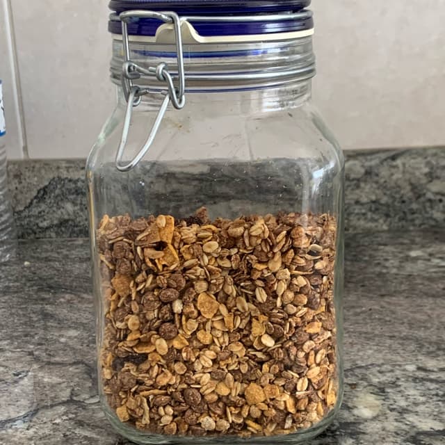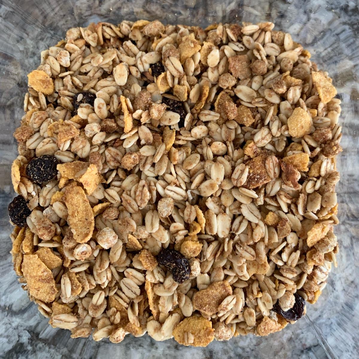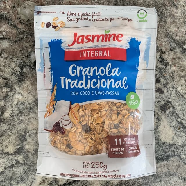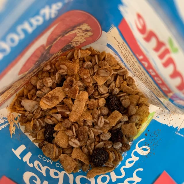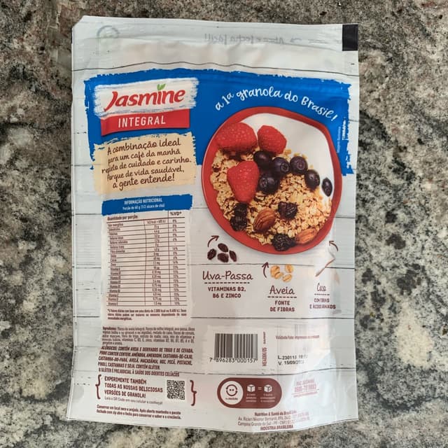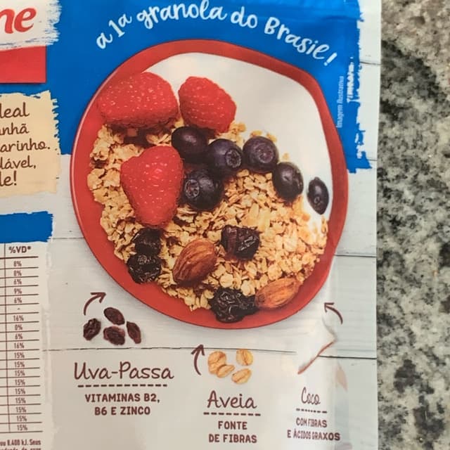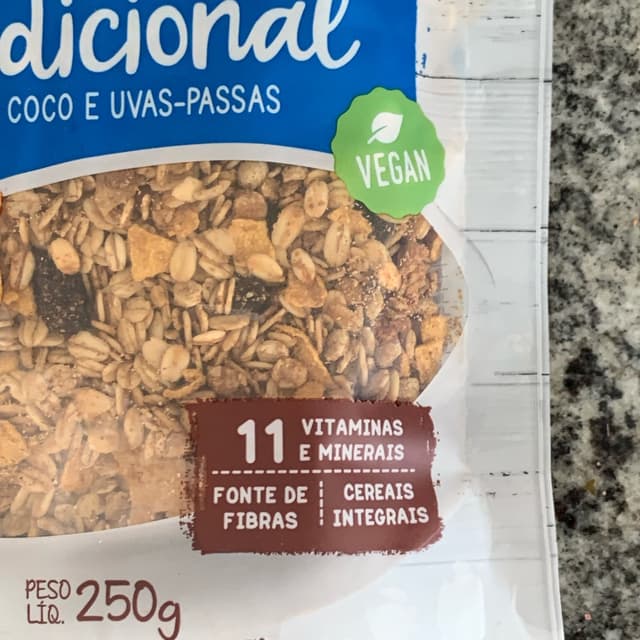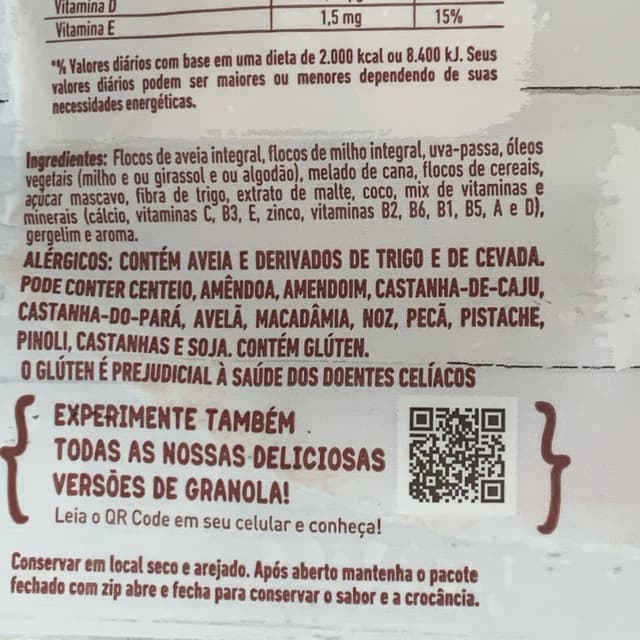 Flocos de aveia, flocos de milho, melado de cana, uva passa, óleos vegetais (milho e ou girassol e ou algodão), açúcar mascavo, fibra de trigo, flocos de cereais, extrato de malte, coco ralado, gergelim, mix de vitaminas e minerais (cálcio, vitaminas C, B3, E, zinco, vitaminas B2, B6, B1, B5, A e D) e aroma.