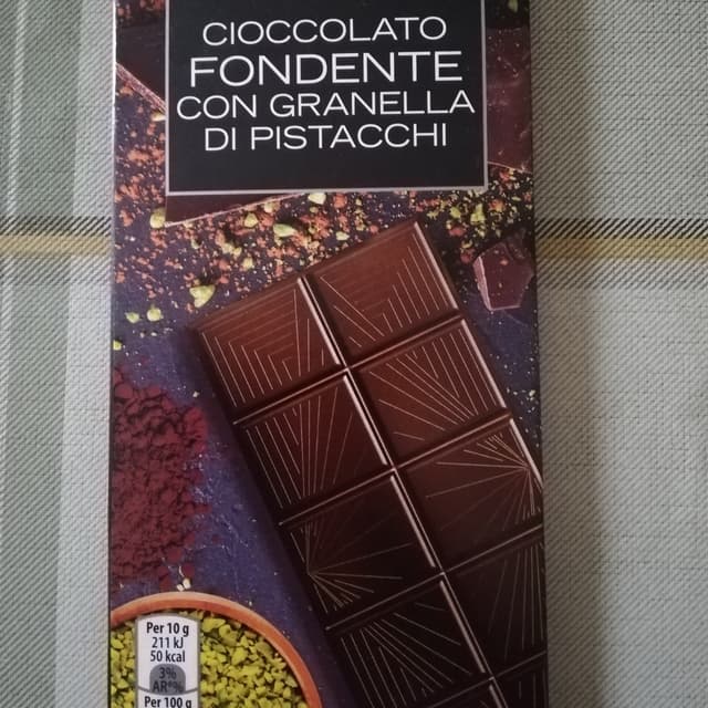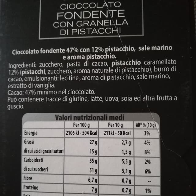 Cioccolato fondente solo al 47%, abbastanza dolce ma anche salato. Il pistacchio c'è ma non sa di pistacchio, si sente un gusto di amaretto. Non è male come sapore ma non c'è da aspettarsi il gusto deciso del pistacchio.