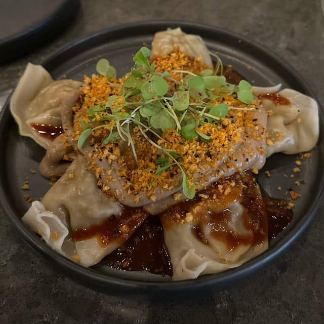 Shiitake, baked tofu, spinach, dark soy, porcini mushrooms, chilli panko, micro arugula, shiitake truffle and spice bean sauce. It was good.
