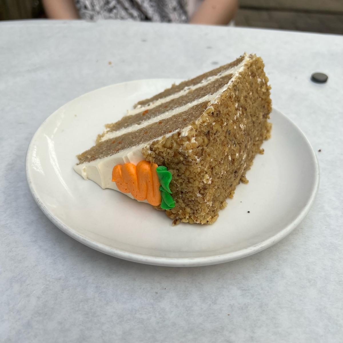 this carrot cake was PHENOMENAL. i was pleasantly surprised by the balance between the cream cheese frosting and the cake; i didn’t feel like the frosting was overwhelming, nor was there too much cake. the cake itself was impressively not dry, and had a moist yet fluffy texture. the nuts coating the exterior of the cake added a subtle crunch without distracting from the other components, and the frosted carrot was a cute addition. i love being able to see the fresh carrot throughout the cake, and i thought it was professionally spiced. this carrot cake has taken the #1 spot in my ranking! definitely would recommend, you can tell these cakes are made with all the love in the world 🤍