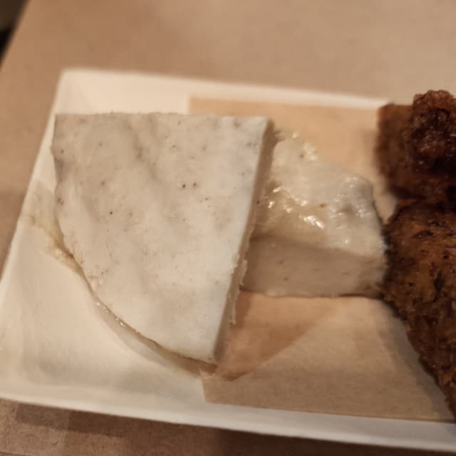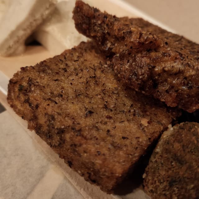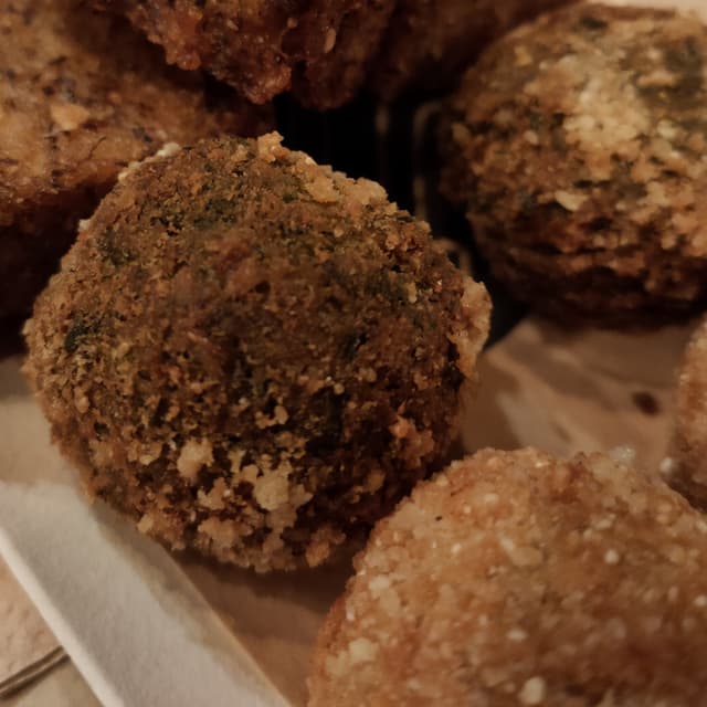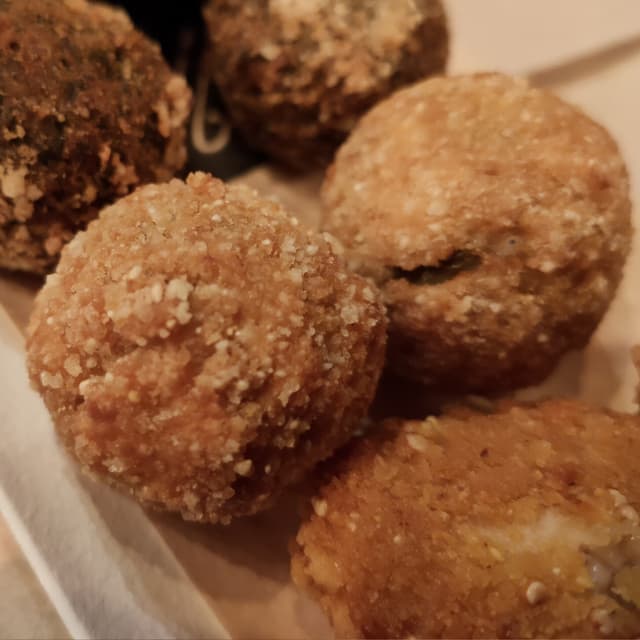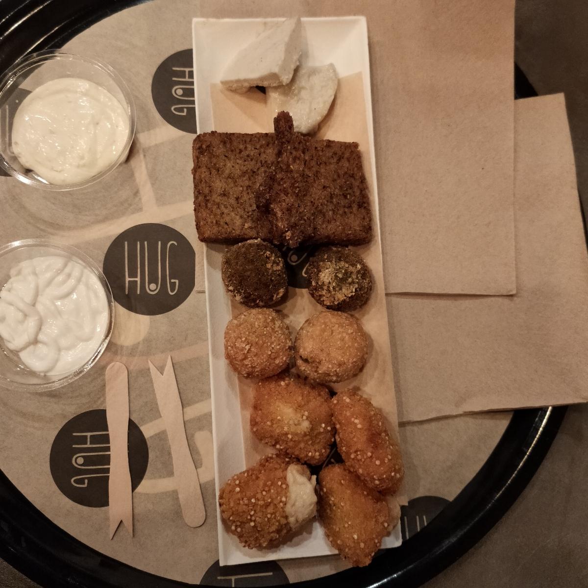 Mix di antipasti davvero ottimo. Nel piatto sono presenti olive ascolane con granulare di soia, mozzarelle in carrozza con mozzarella di arachidi, falafel speziati, polentine e Brie di arachidi. Il tutto viene accompagnato da due mayo vegetali, una classica e una all'arancia fermentata. Davvero gustoso.