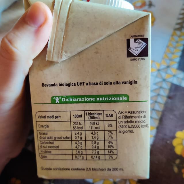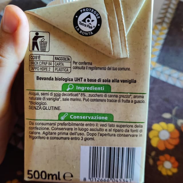 Dall'aspetto mi sembrava un latte di soia normale (con zuccheri aggiunti) e invece è anche aromatizzato alla vaniglia 🙈 il sapore è buono ma stufa