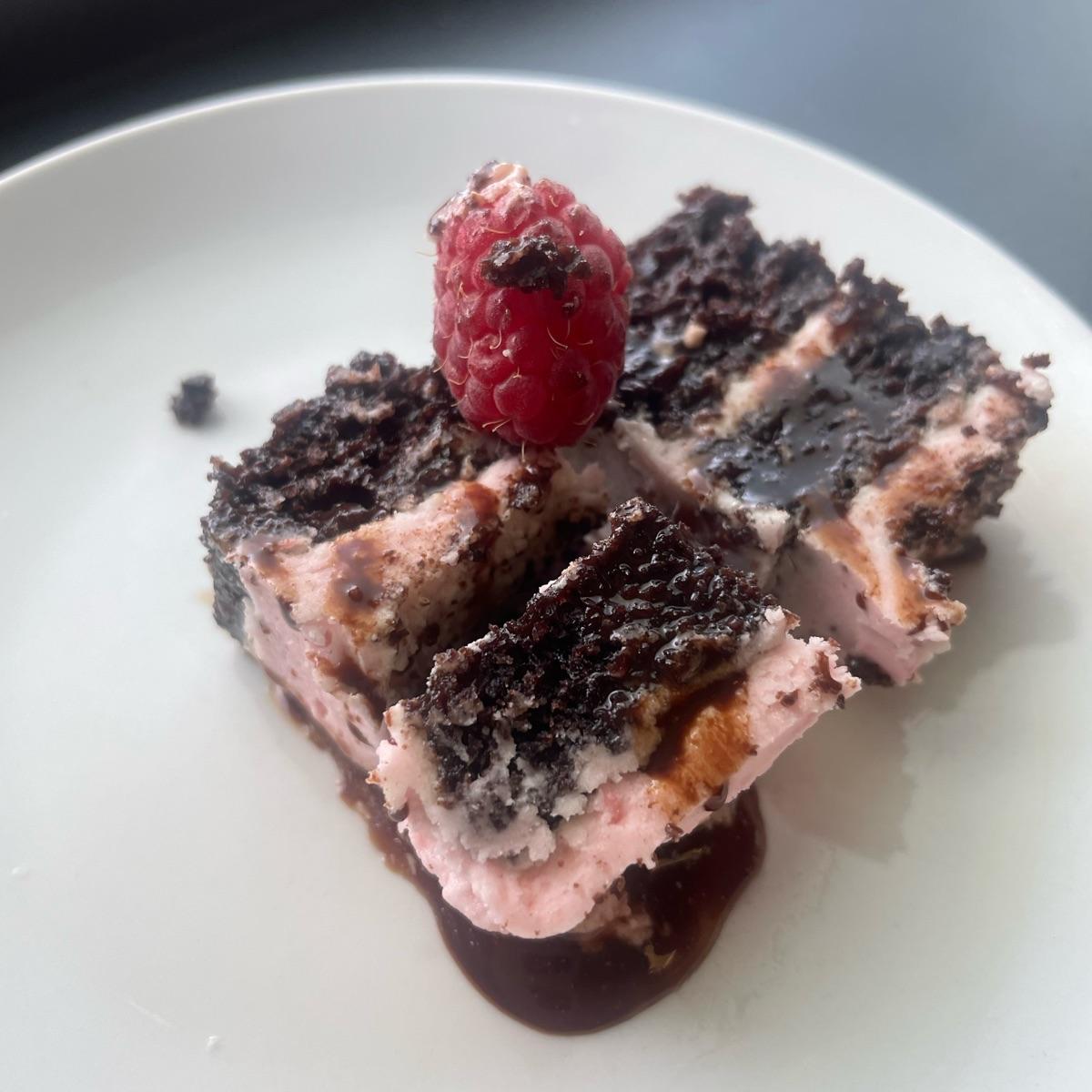 This large slice of cake had layers of raspberry cream and chocolate cake. Was too dry and expensive for my liking