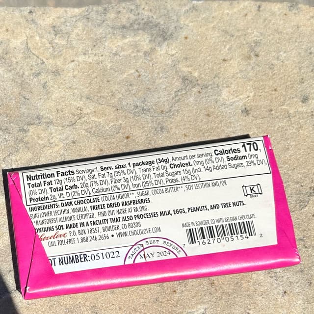I love this chocolate! The freeze dried raspberries really give this rich tasting chocolate a bright and sweet flavor. I was honestly expecting a raspberry filling but I was pleasantly surprised it actually had little freeze dried berries! Both of the flavors compliment each other perfectly! Would definitely recommend!
