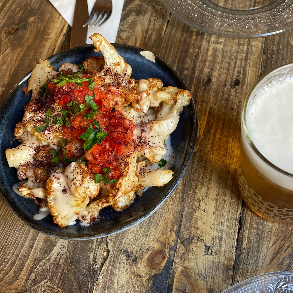 Muy sabrosa esta coliflor, el tahini y el picadillo de verduras le quedaban genial. Este sitio es vegano y vegetariano 🌱