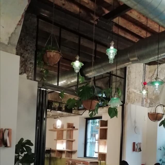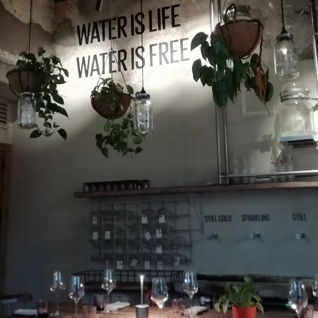 È un bel locale, con tanto verde (c'é anche un vaso con una piantina ben curata su ogni tavolo), plastic free e con un sistema di microfiltrazione dell'acqua che diventa elemento d'arredo.
