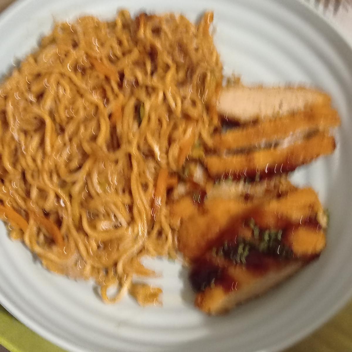 Yakisoba con filete empanado de heura. Muy rico. Lo hemos pedido para entrega a domicilio.