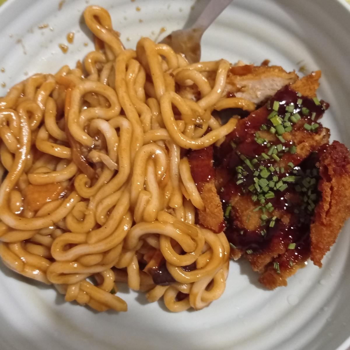 Plato de udon con filete empanado de heura. Está muy rico aunque creo que viene poca cantidad. Lo hemos pedido para entrega a domicilio.
