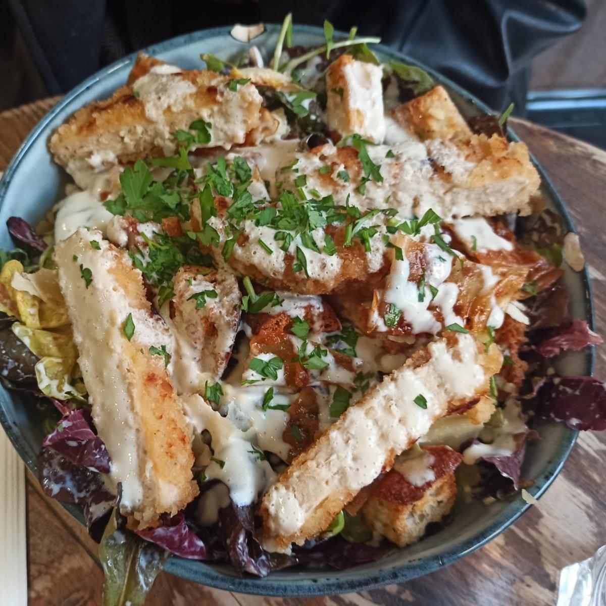 🤤🤤🤤 This is amazing!!! The fake chicken at Aujourd'hui demain is just too good. Other ingredients are mix of seasonal salads, homemade Caesar sauce, croutons, Gondino no-Parmesan shavings, homemade no-Bacon shavings, fresh parsley. Super recommended 🙏
