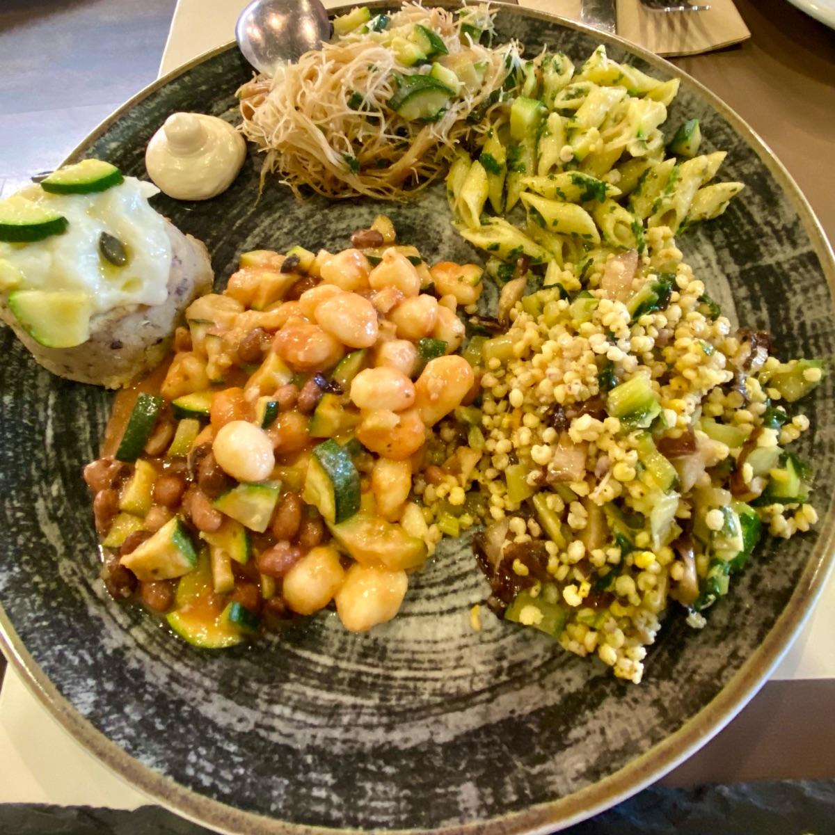 In questo piatto troviamo da sx spaghettini di riso con zucchine, pennette al basilico, sorgo con radicchio e zucchine e gnocchetti con fagioli e zucchine. Tutto molto buono e curato. Il primo che ho preferito sono gli gnocchetti: il sugo con pomodoro, fagioli e zucchine era davvero squisito🤤🤤🤤