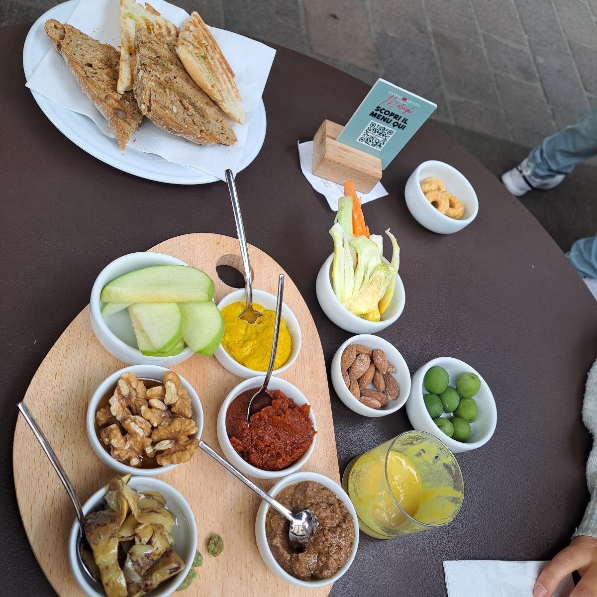 Taralli, olive e pinzimonio arriva di default con il drink e poi abbiamo ordinato un tagliere vegano che era da dividere in due. Si trattava di tre salsine spalmabili (hummus, paté di olive e di pomodori secchi) più altri piccoli accompagnamenti. Il pane in accompagnamento te lo riportano se finisce.