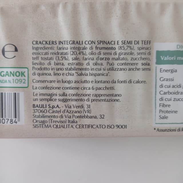 Cracker integrale con aggiunta di spiaci e semi di teff.