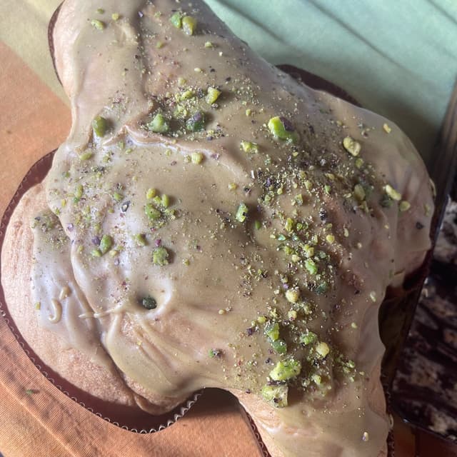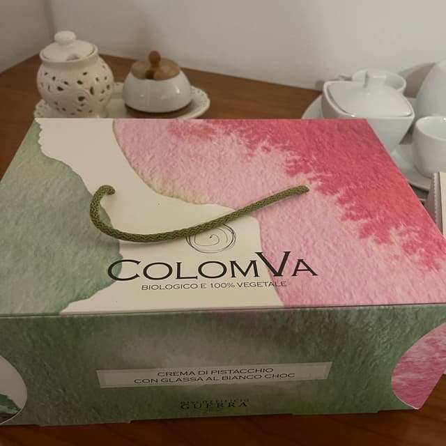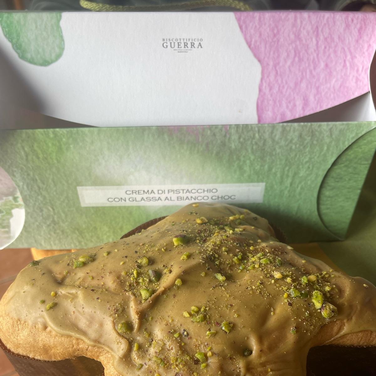 Molto morbida e delicata questa colomva ricoperta di cioccolato bianco e ripiena con tanta crema al pistacchio! È piaciuta molto, prezzo sui 25€ ottimo prodotto 👌 #colomba #pasqua #pasquavegana #vegustibus