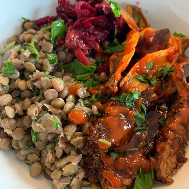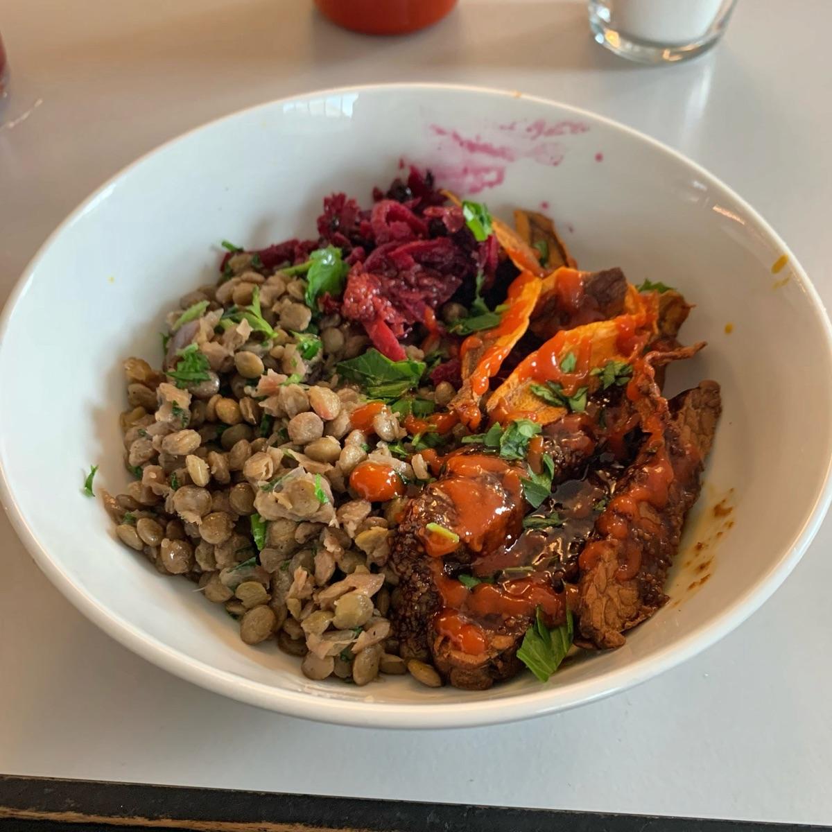 Warm lentil salad with tempeh marinated in mustard and maple syrup, pickled beets, baked carrot and fennel cream, carrots chips. Delicious!