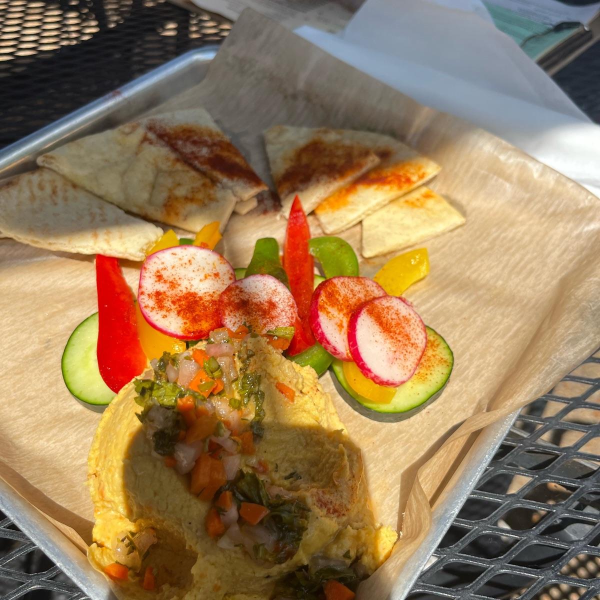 Delicious fresh hummus with fluffy pita and crunchy veggies. Simple and perfect. Had more hummus than scoop-ables.