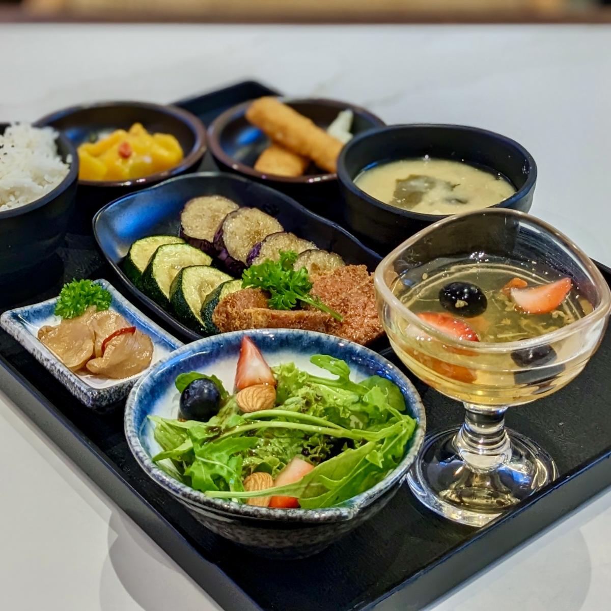 Nicely plated set inspired by the bento boxes Greendot is known for, while integrating the main dish from the popular Veg-An collab! Featuring succulent grilled #happiee soy 'salmon' chunks with zucchini and eggplant in sweet and tangy amazu vinegar sauce. There was also a bowl of umami miso soup with seaweed, mushrooms, and silken tofu. In place of the Japanese-style sides from the original collab, this version came with #happiee konjac 'fish fingers' with vegan mayonnaise, Greendot's classic braised pumpkin with goji berries, mixed berry and almond salad in balsamic vinegar, as well as osmanthus jelly with fruits. The weak link was the white rice which was too dry and hard for my liking. Overall a balanced and nice set, and great for those who find it inconvenient to catch the Wazen menu at Greendot One Raffles Place! (Allium-free, $15.90) #sgvegan #sglocal