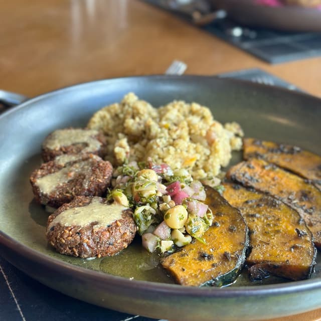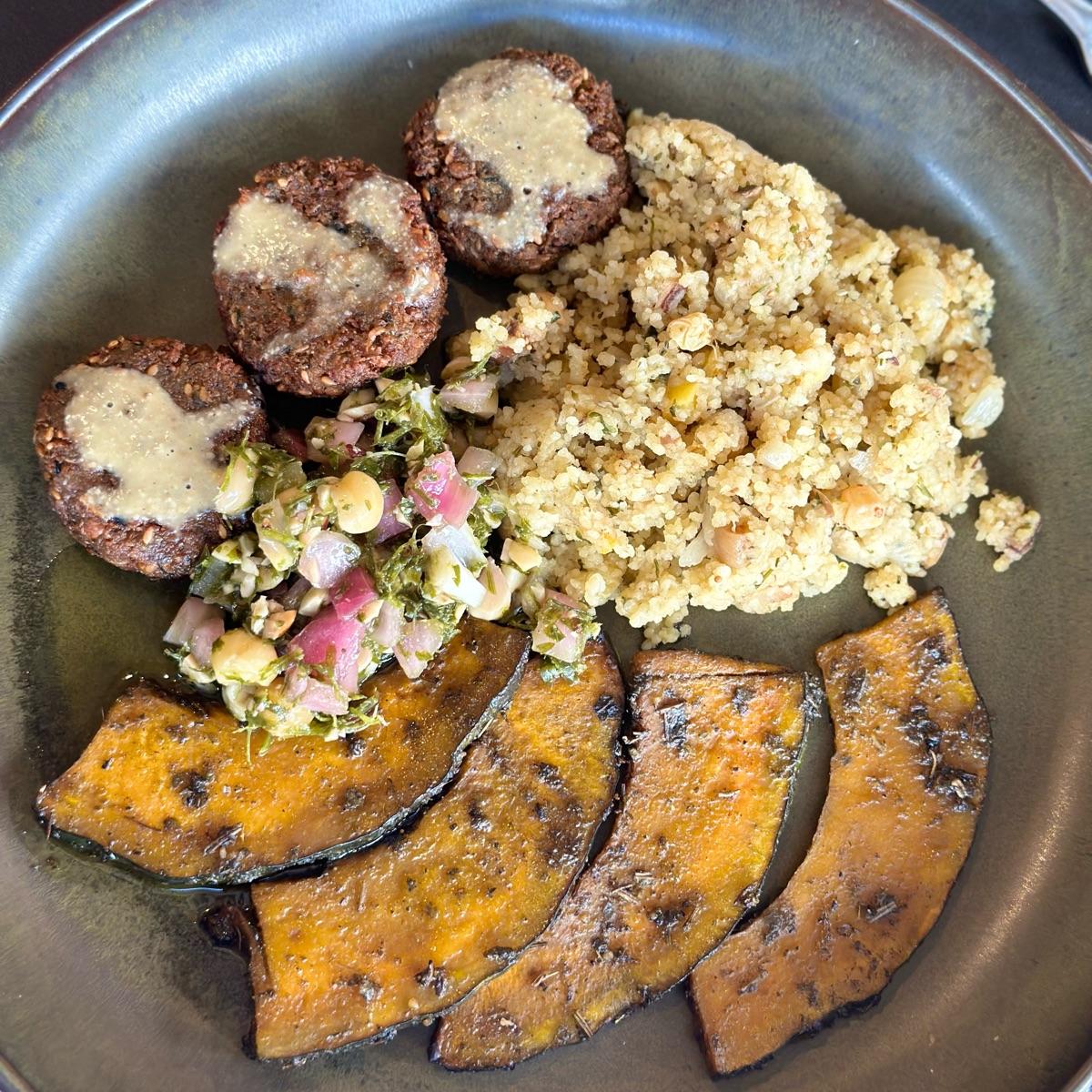 Prato novo no cardapio, com falafel, abobora e cuscuz marroquino. Achei bem servido e o molho de tahine combina muito bem.