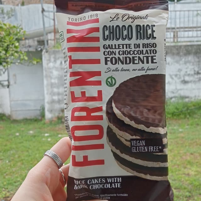 Gallette di riso con copertura al cioccolato fondente. Confezione da 6 gallette. Sono sottili e il cioccolato non era molto amaro. Abbastanza buone