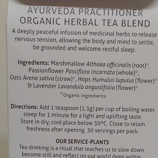 Marshmallow root, passionflower, oats/straw(?), hops and lavender. Good night! 🤣