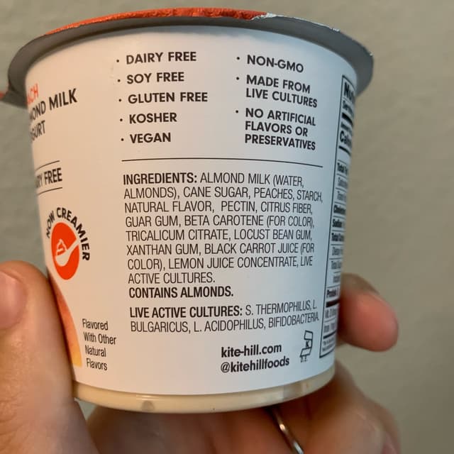 This peach almond milk yogurt tastes great! The texture is a bit runny but it has a nice peach flavor and a good amount of protein and nutrients. Great for gut health cause it comes with live cultures👍🏼 healthy👌🏼