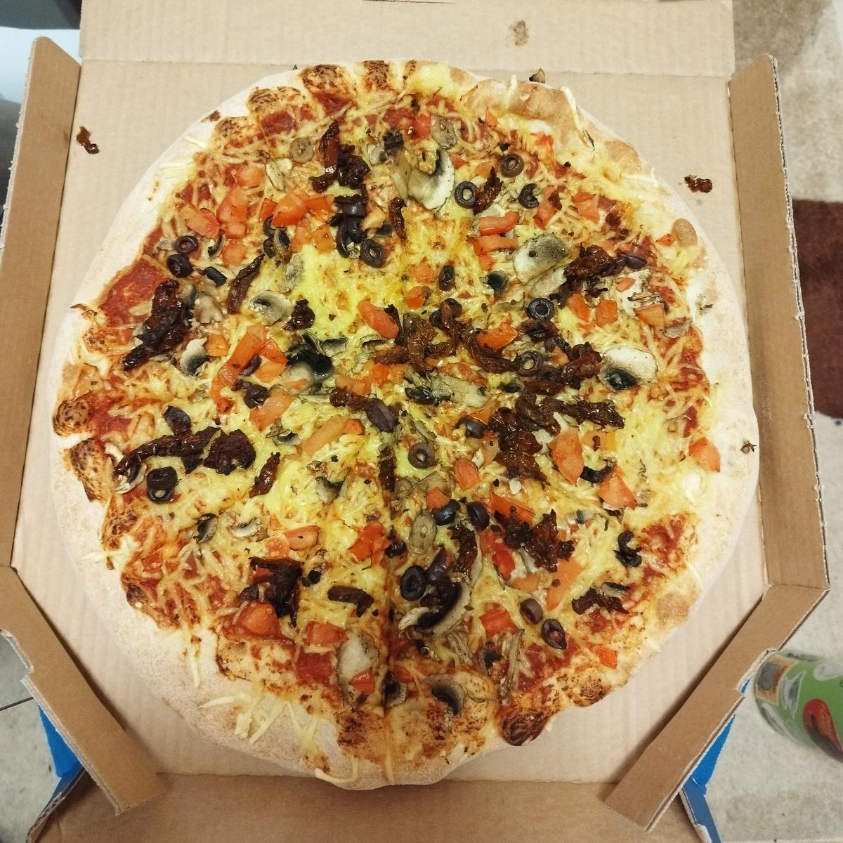 An easy vegan pizza with vegan cheese, sun dried tomatoes, olives and other vegetables. You can get 2 jumbo sized for 25 lv, ridiculously cheap.