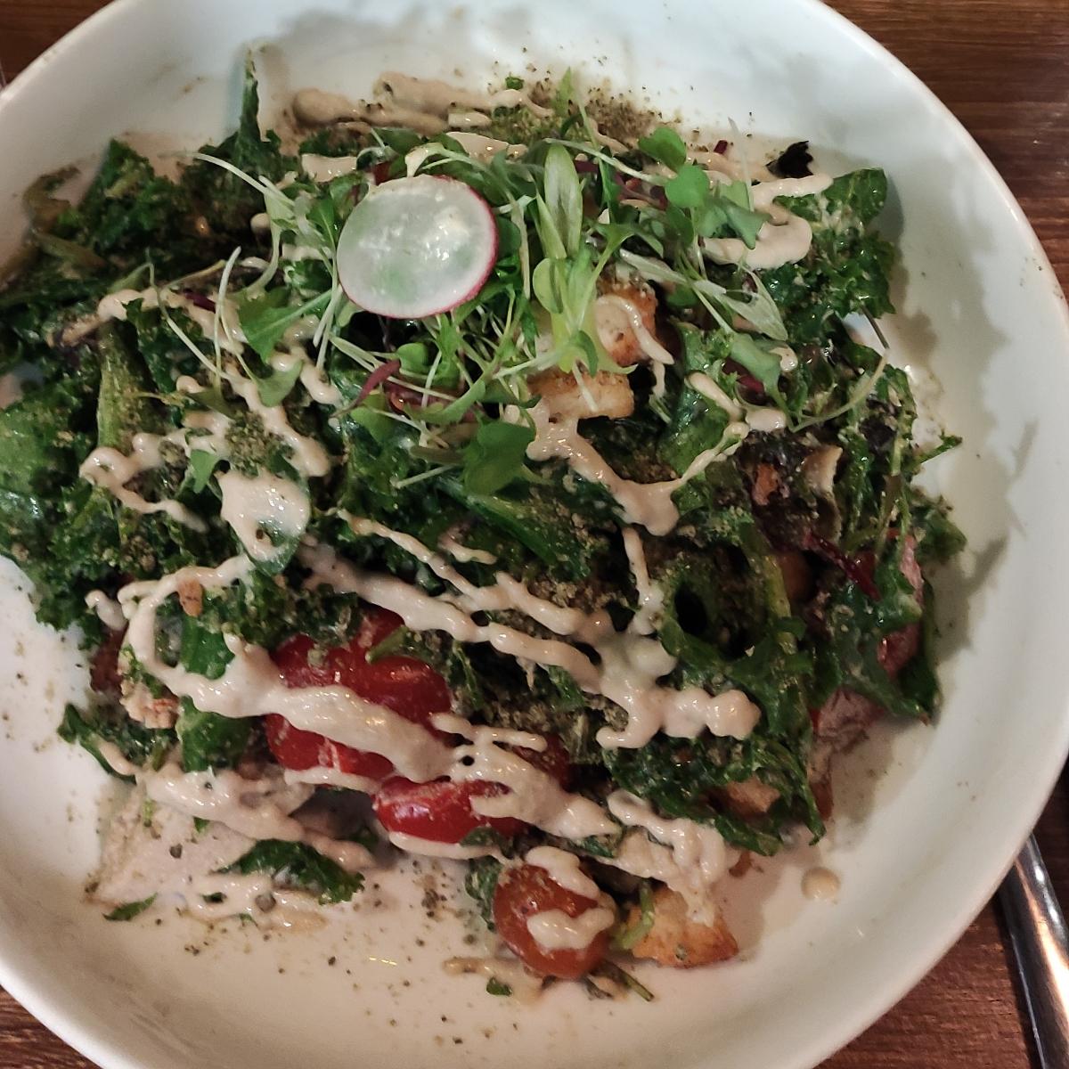 Je pense la meilleure salade césar que j'ai pu manger. Elle était tellement savoureuse et j'adore l'idée d'avoir remplacer la salade par du kale ça lui donne vraiment de la personnalité. Le "poulet" et les croûtons etaient vraiment réussis et la sauce vraiment délicieuse. Par contre j'aurai aimé avoir le choix de doser la quantité de sauce ou bien qu'ils en mettent moins. Là c'était un peu trop pour moi mais mis à part ça, un excellent plat.