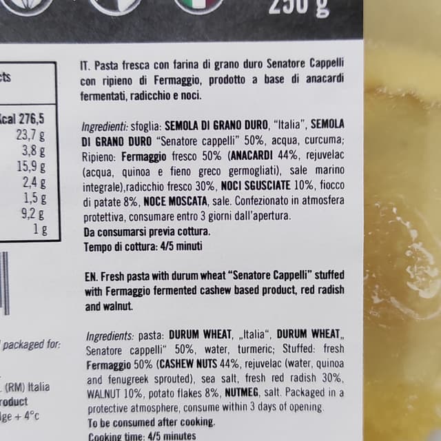 Questi ravioli sono semplicemente buonissimi. Innanzitutto aprendo la confezione ci si trova davanti a dei ravioli freschi proprio fatti in casa, tra l'altro la farina d'impasto è quella di grano Senatore Cappelli. . Ripieno gustoso di fermaggio(tipico formaggio vegan