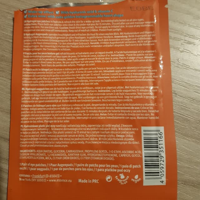 Patch occhi essence. Sono abbastanza buoni, ma la forma (carinissima) li rende un po' scomodi da applicare. L'effetto e' blando ma un aiutino lo danno