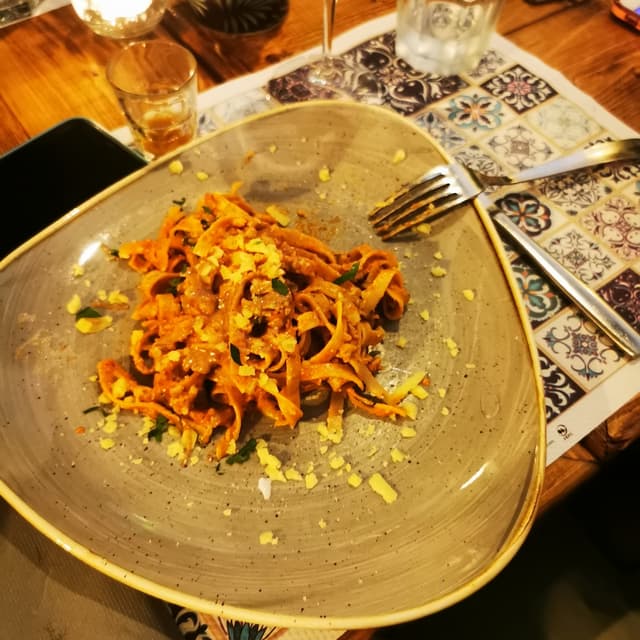 Piatto gustosissimo con ragù vegano di nocciole. Pasta di qualità cotta al punto giusto. L'impiattamento semplice si presenta comunque bene.. La porzione decisamente abbondante.