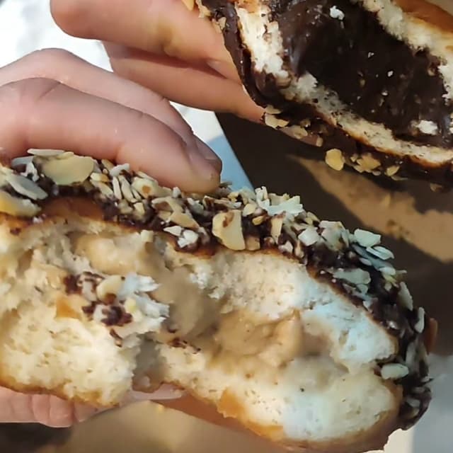 Prima di fare la recensione di questo donut mi sento di dirvi che se avete in programma un viaggio a Dublino dovete segnare su Google Maps tutti i chioschi di The Rolling Donuts perché ci andrete fino a che non avrete provato tutti i donut vegani in vetrina (credo 8 o 9). Questo era ripieno di crema al burro di arachidi e glassato con cioccolato e granella di arachidi. Che dire? Una bomba in tutti i sensi! Soprattutto per chi come me nel burro di arachidi ci farebbe il bagno ogni mattina. Costo 3,30 euro.
