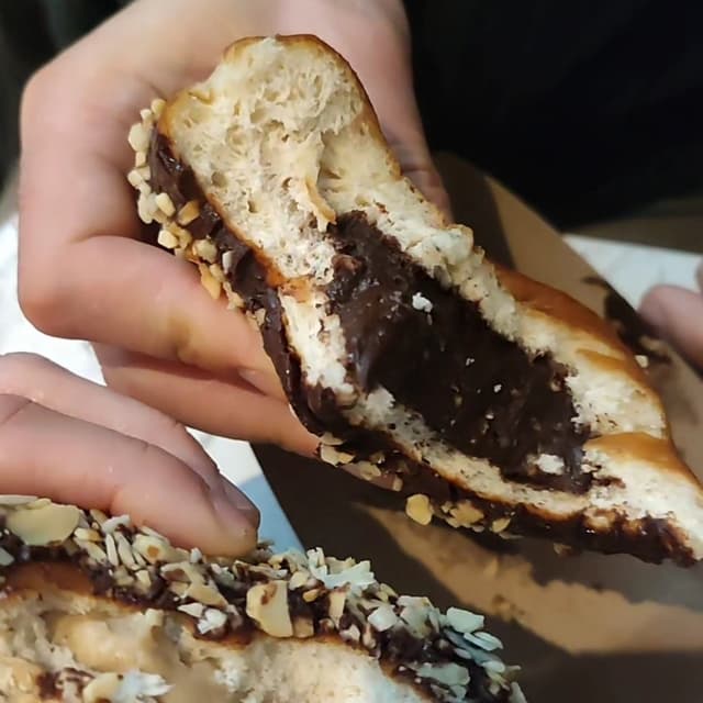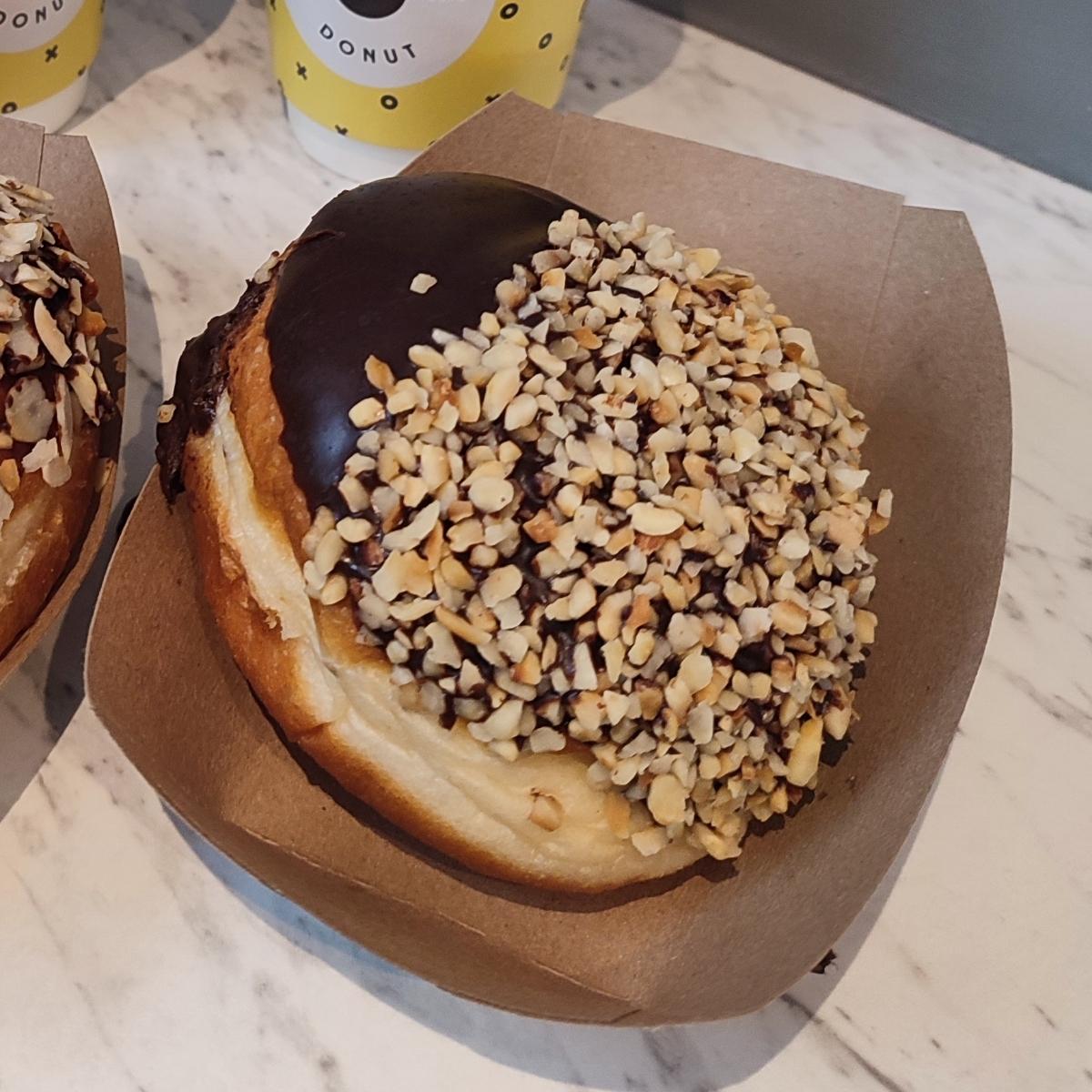 Questi donuts sono diventati una dipendenza nella vacanza a Dublino! Questo è ripieno con crema al cioccolato e nocciole e ricoperto di glassa al cioccolato e granella di nocciole: il sapore era proprio quello del Ferrero Rocher! Secondo il mio ragazzo era poco zuccherato (???). Ripieno super abbondante e impasto molto soffice. Costo 3,30 euro.